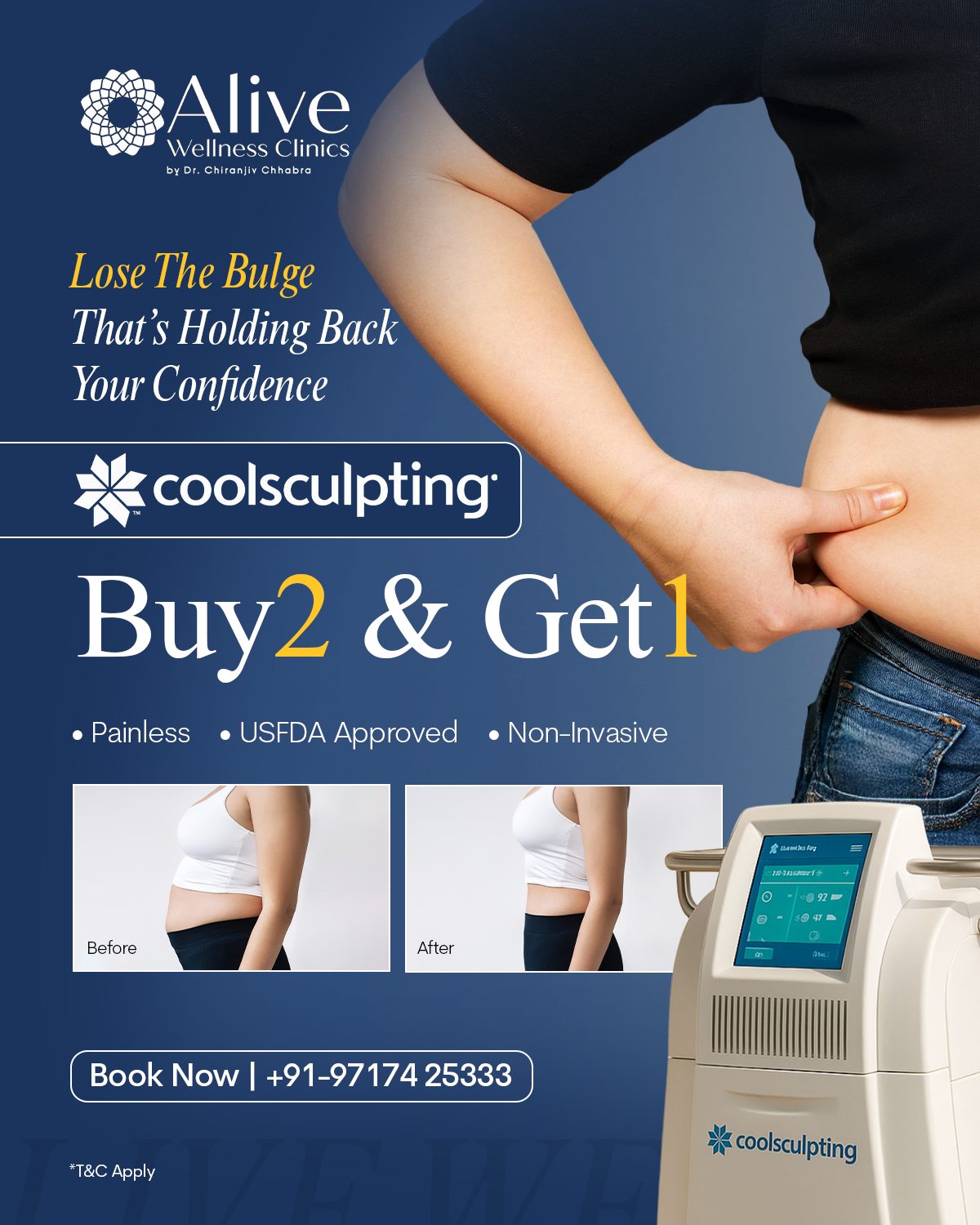 Our team of expert practitioners and seasoned professionals at Alive Wellness Clinics understands your aesthetic needs and lifestyle restraints. Founded by Dr. Chirajniv Chhabra, Chief Celebrity Dermatologist with over 3 decades of experience, our women-centric team recognizes the struggles and time constraints faced by modern women in their quest for beauty and self-care. This is why we offer over 1200 aesthetic and skin treatments in Delhi to help women prioritize their self-confidence and overall well-being. So, book a session today and empower yourself to deal with the world with confidence and grace!